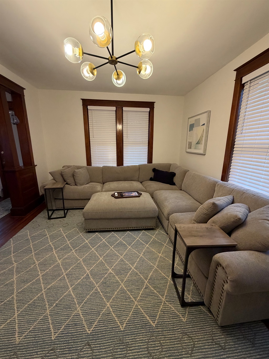 The spacious living room features a large sectional sofa—perfect for relaxing, watching TV, or gathering with family and friends. Original woodwork and historic architectural details give the home its authentic charm, while updated furnishings provide a comfortable and welcoming atmosphere.