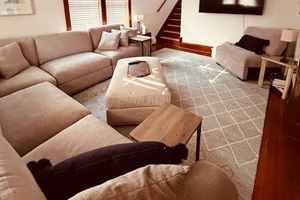 The home features a spacious living room with a large sectional sofa—perfect for relaxing after a day of sightseeing. Original woodwork and period details give the house its authentic historic feel, while updated furnishings provide a comfortable and welcoming atmosphere.