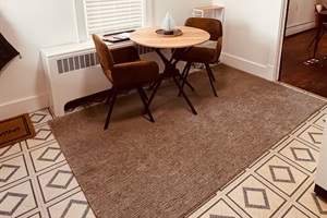 The dining area connects the living room and kitchen, creating a convenient space for meals, games, or planning your next outing. The fully equipped kitchen includes a stove, microwave, coffee maker, and all the essentials needed for preparing home-cooked meals.