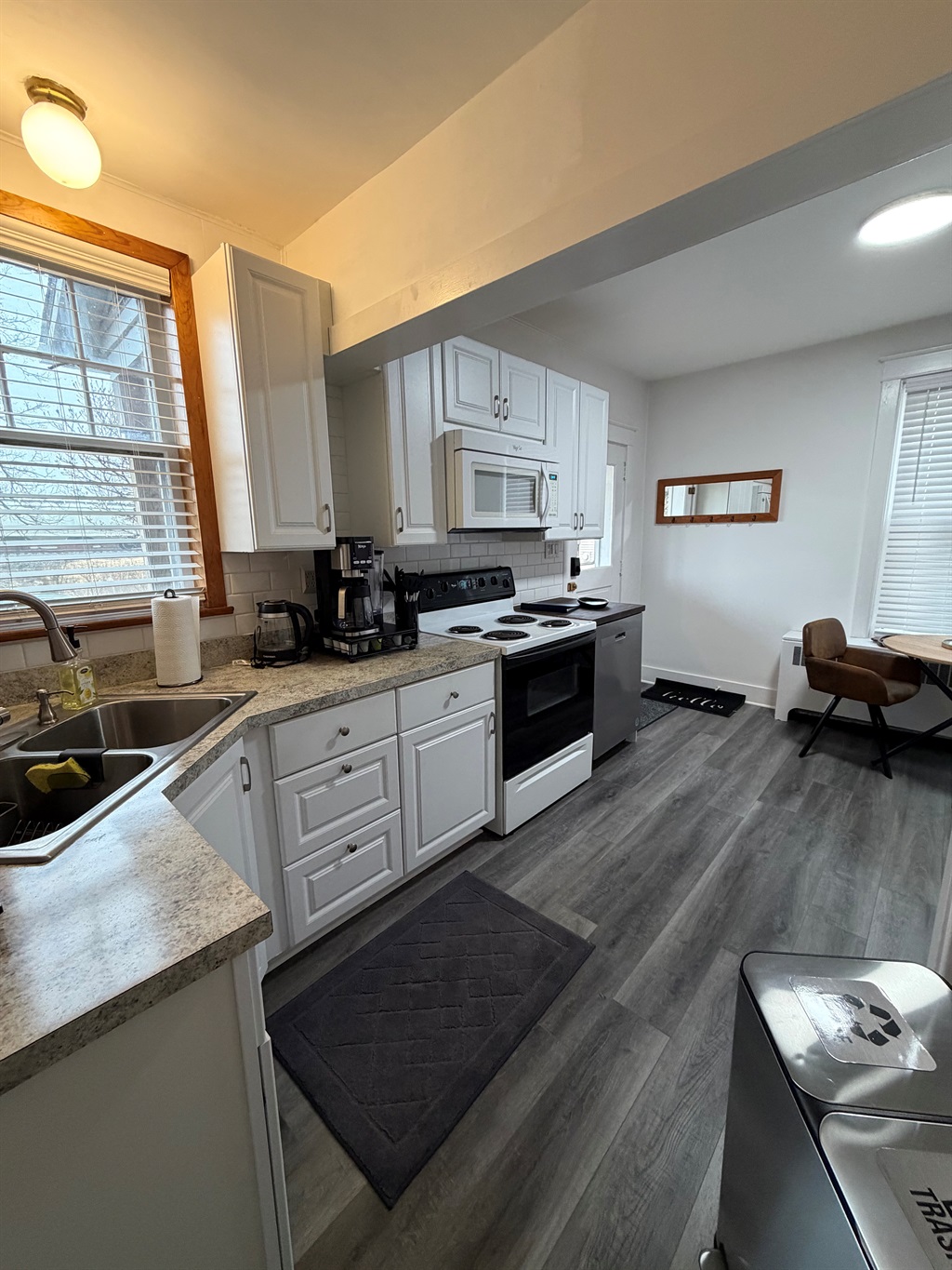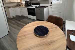 The fully equipped kitchen includes a stove, microwave, coffee maker, and everything needed to prepare simple meals during your stay.