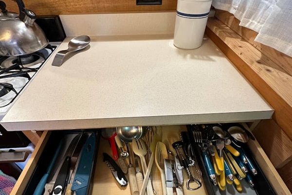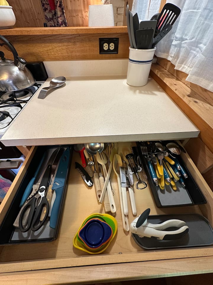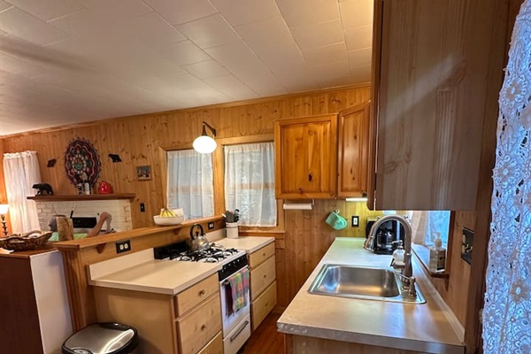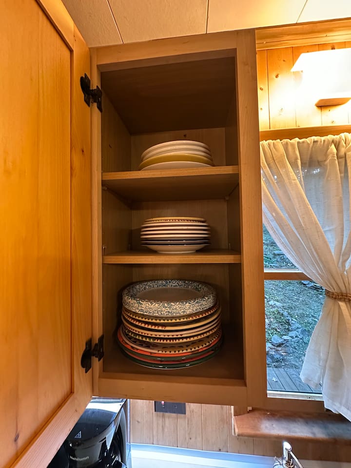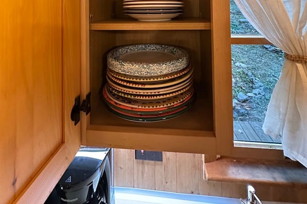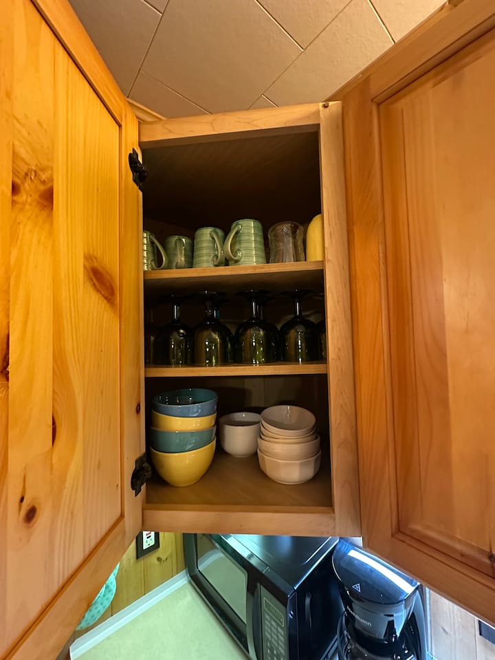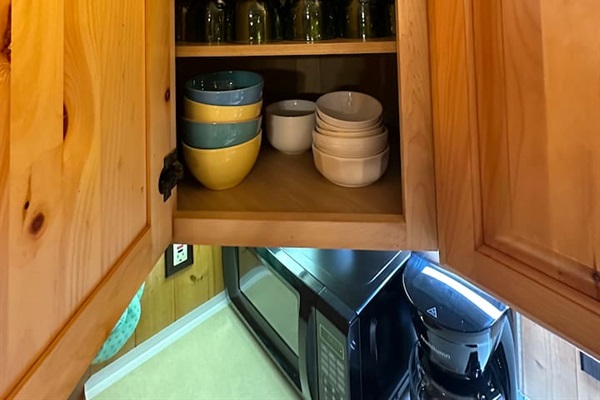 Fully stocked kitchen with everything you need—cookware, utensils, dishware, and coffee maker. Compact yet efficient, ready for cooking meals or enjoying takeout with ease.