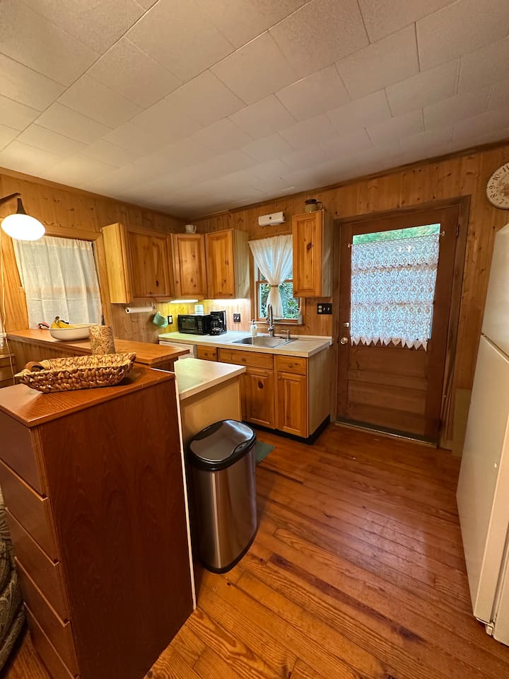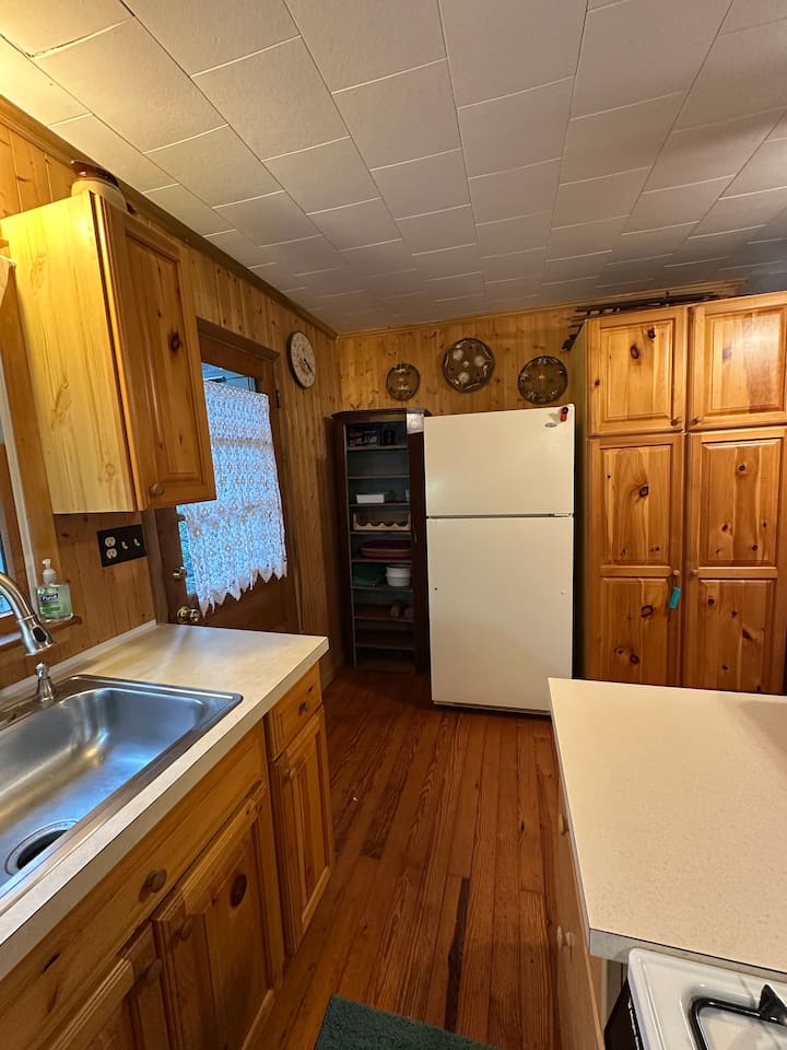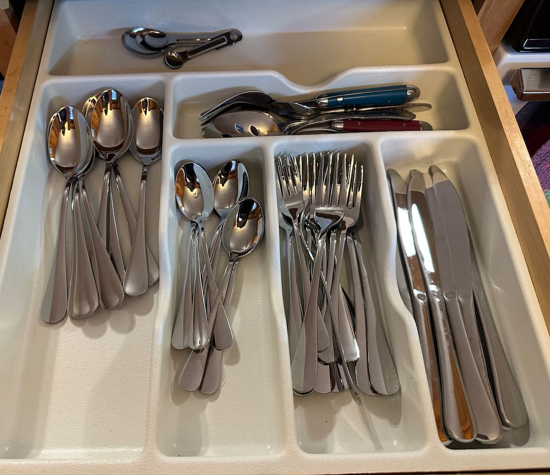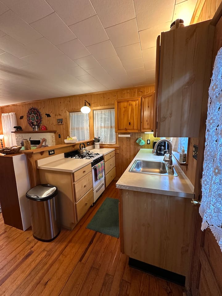 Fully stocked kitchen with everything you need—cookware, utensils, dishware, and coffee maker. Compact yet efficient, ready for cooking meals or enjoying takeout with ease.