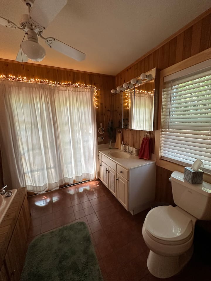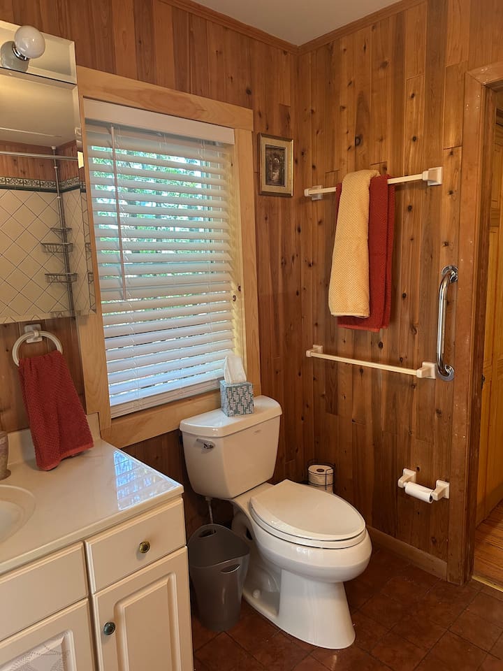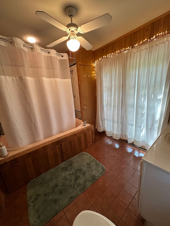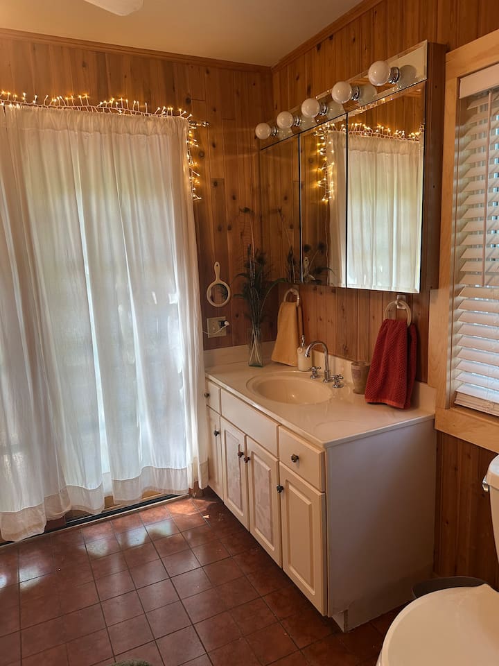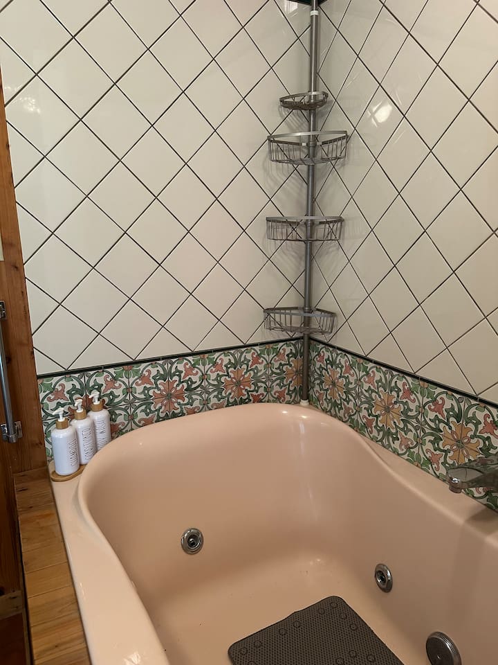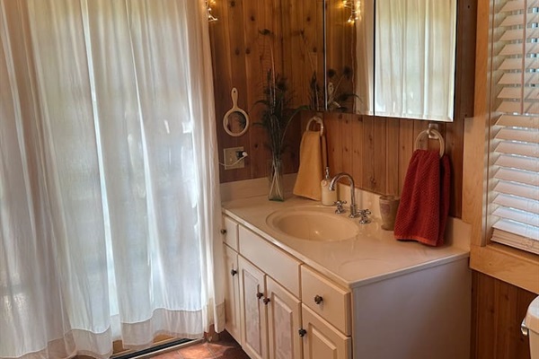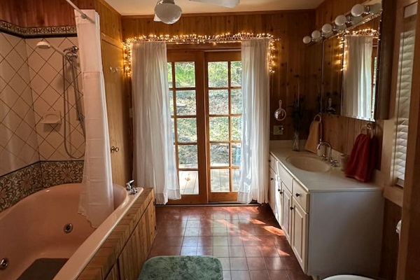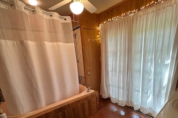Clean and functional bathroom with full-size shower/tub combo, fresh towels, shampoo, conditioner and body wash provided. The tub is a soaking functional Jacuzzi tub.