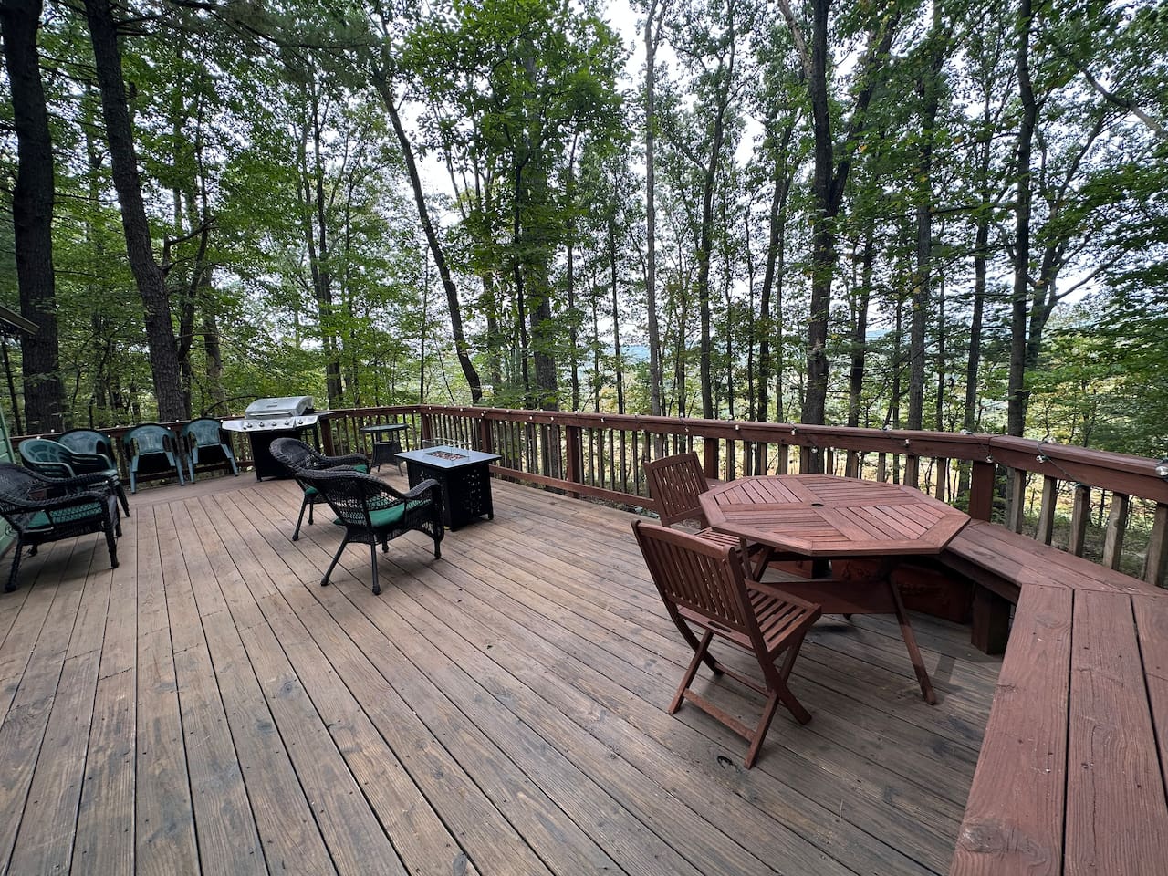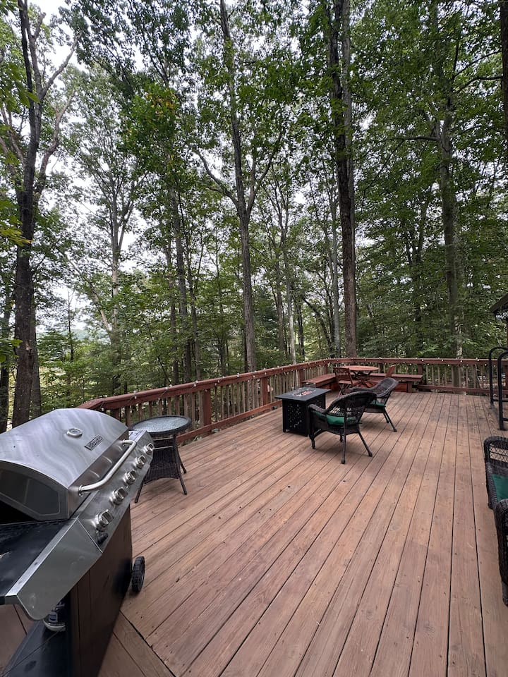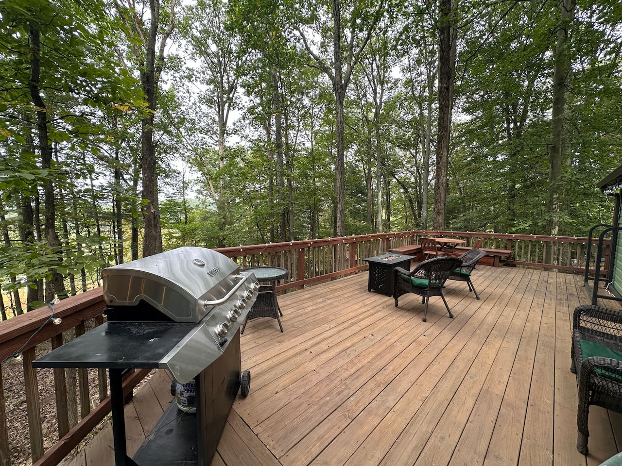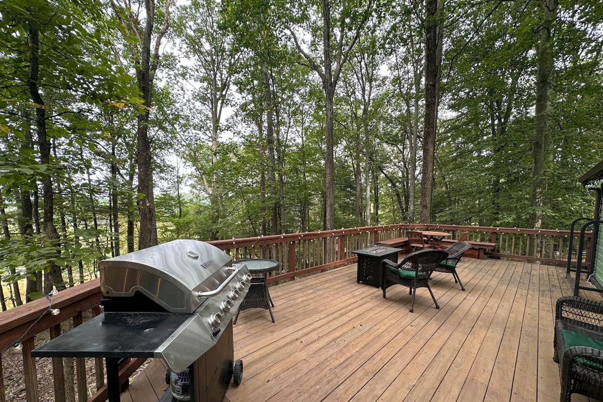 Spacious deck wraps ¾ of the way around the cabin—perfect for sipping morning coffee, enjoying dinner al fresco, or relaxing with a glass of wine. Includes a gas grill and gas fire pit for cozy evenings under the stars.