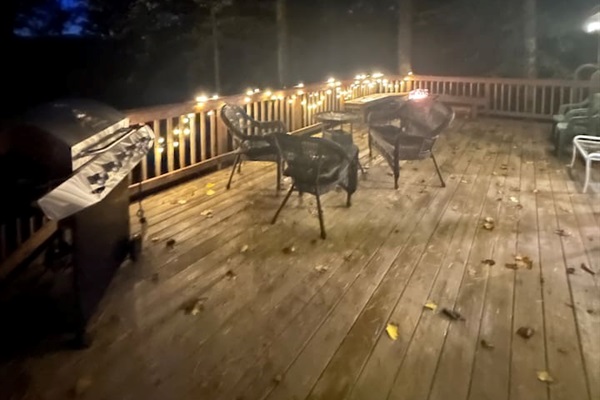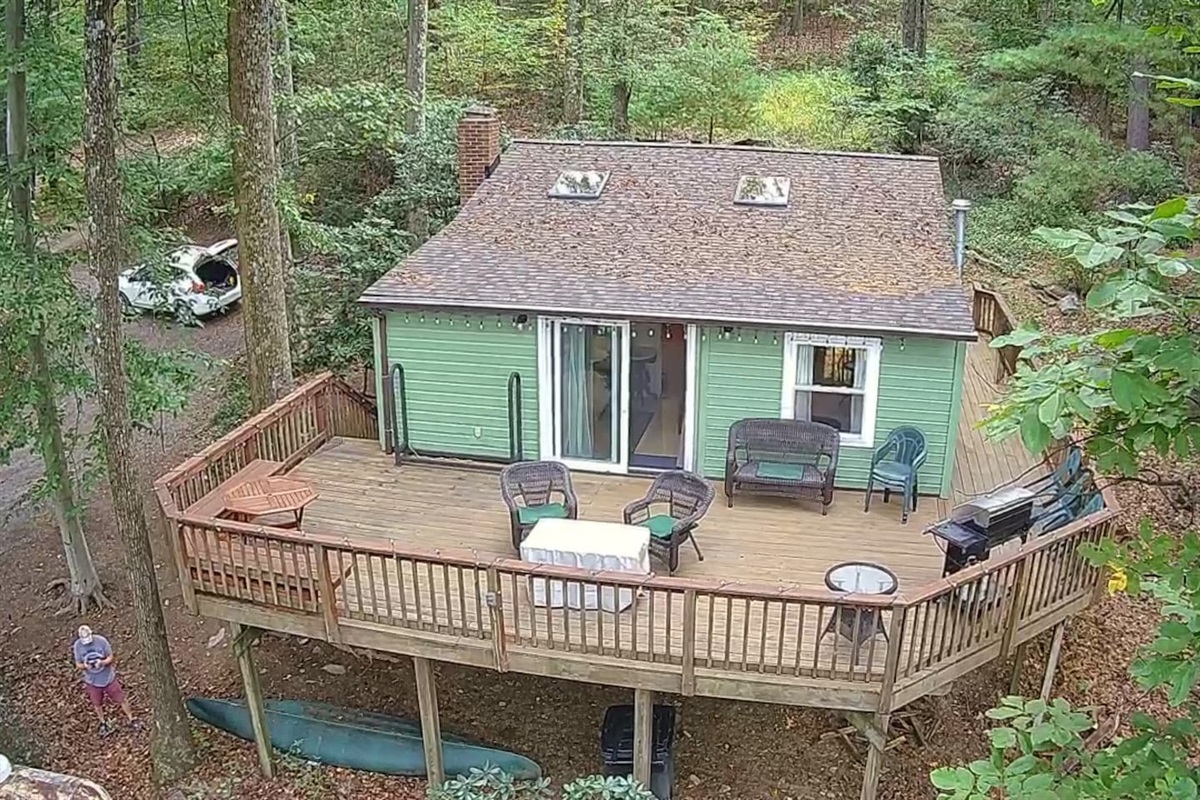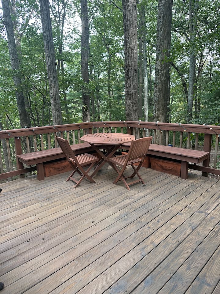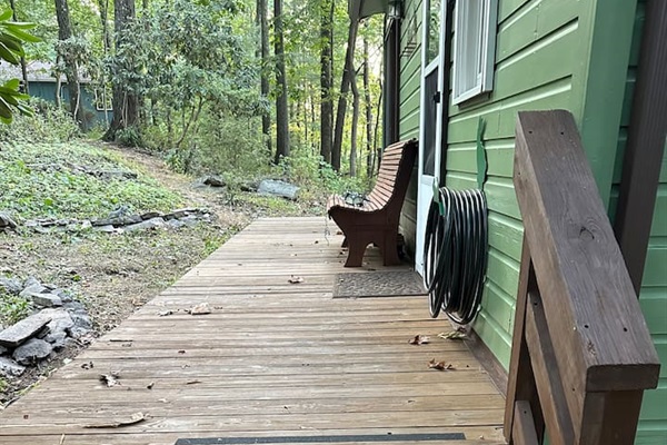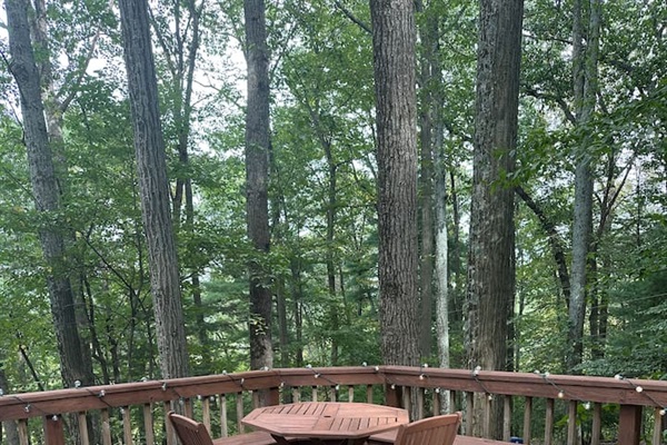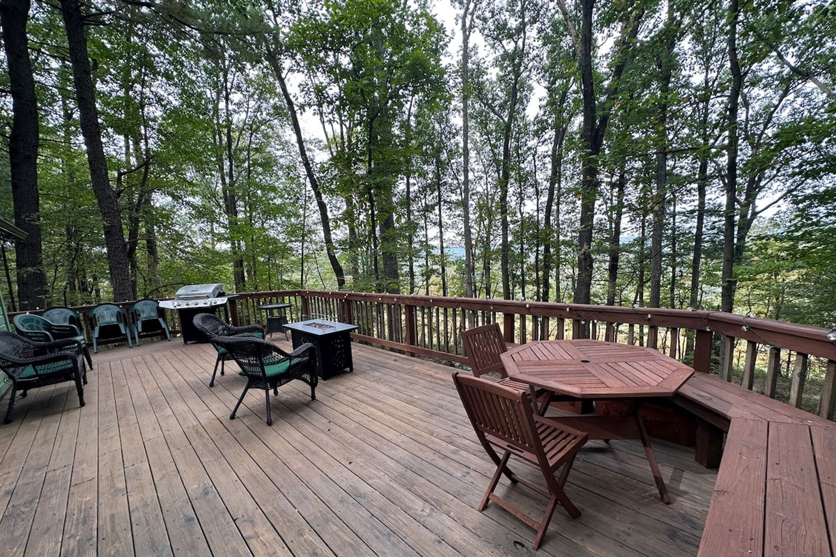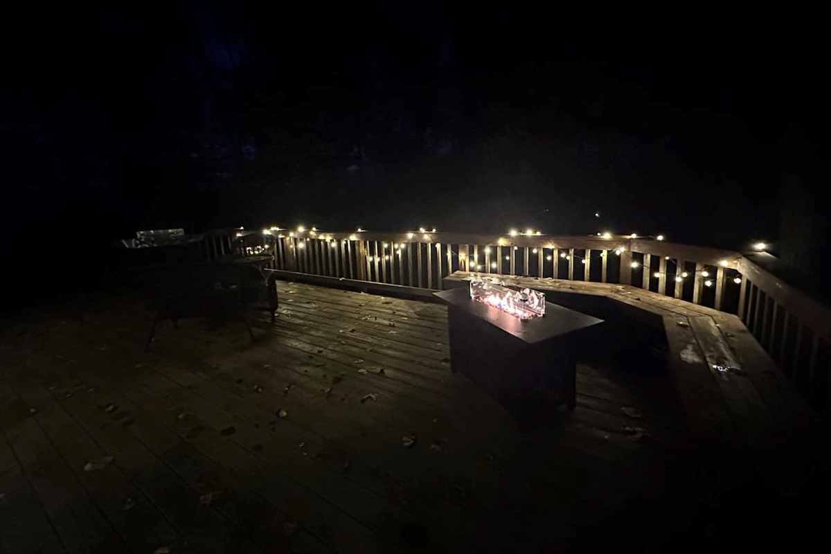 Spacious deck wraps ¾ of the way around the cabin—perfect for sipping morning coffee, enjoying dinner al fresco, or relaxing with a glass of wine. Includes a gas grill and gas fire pit for cozy evenings under the stars.
