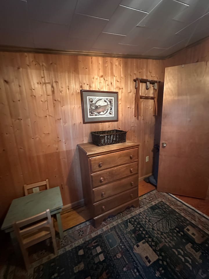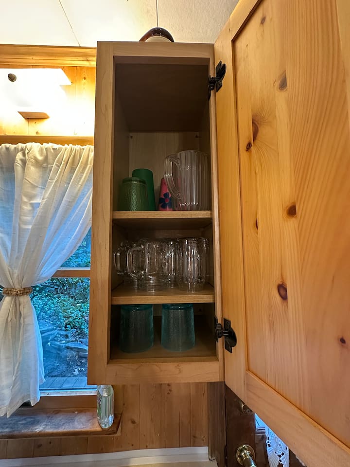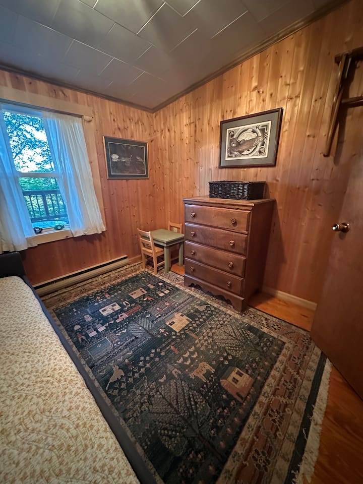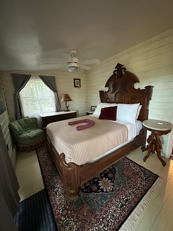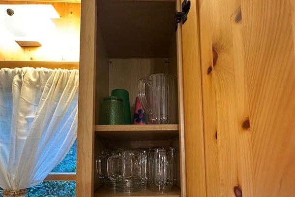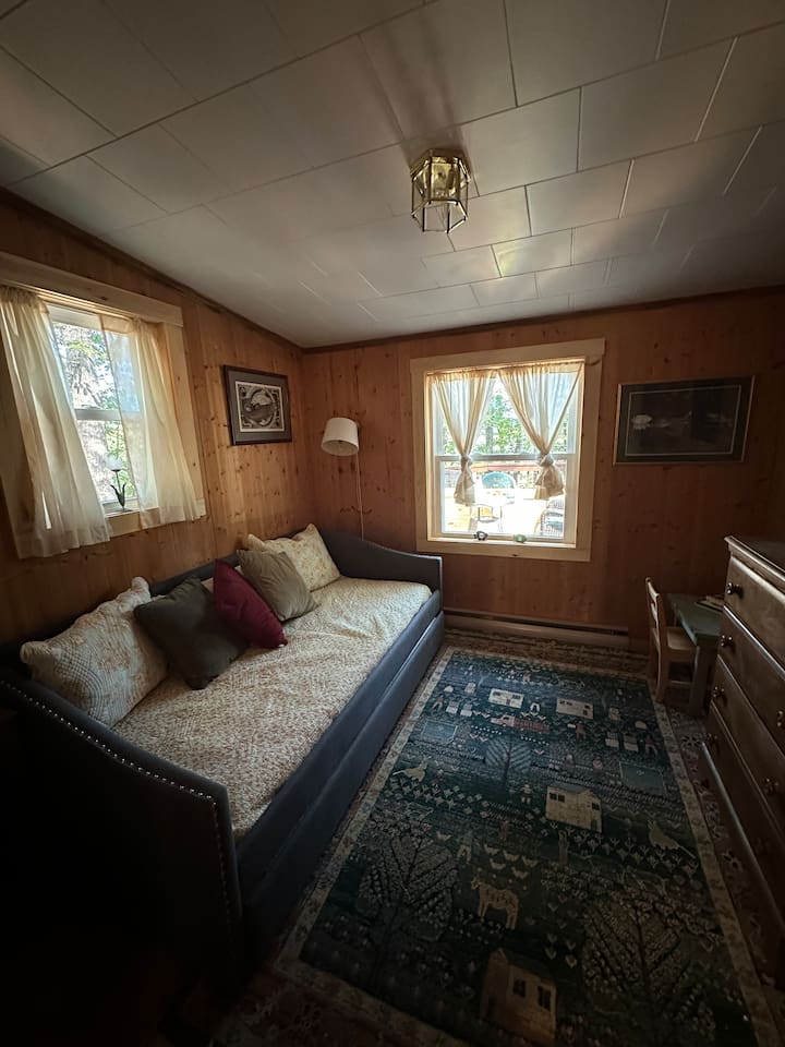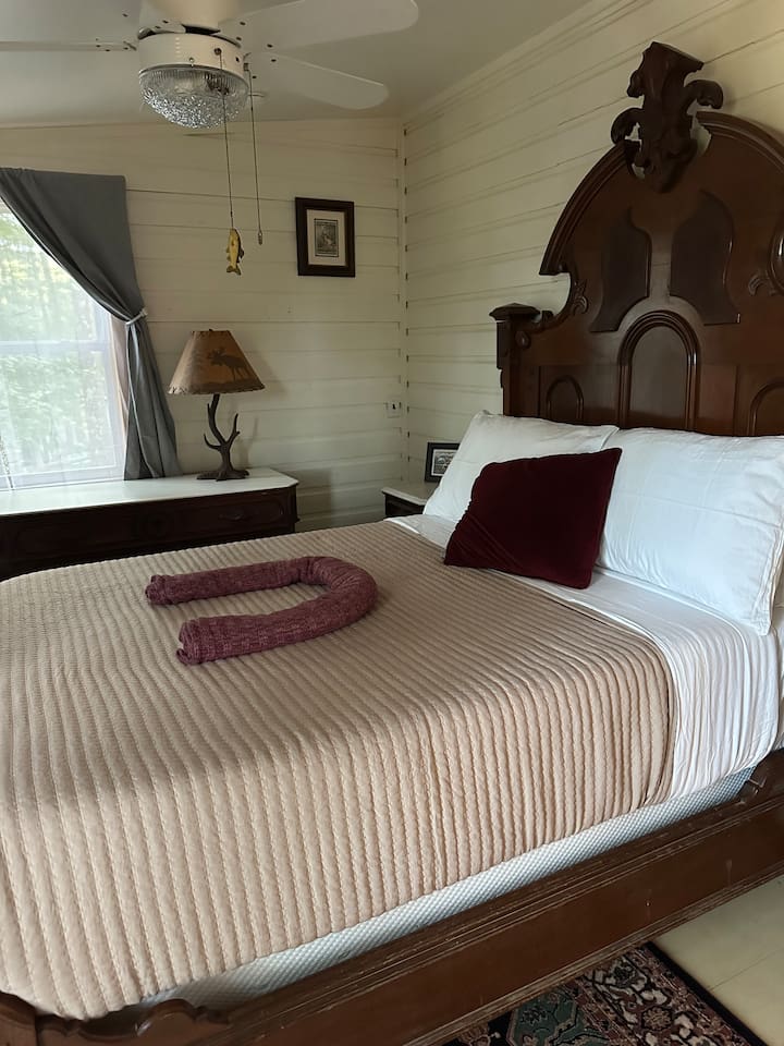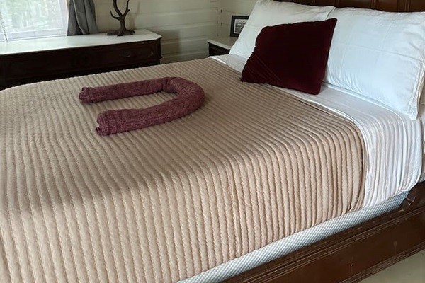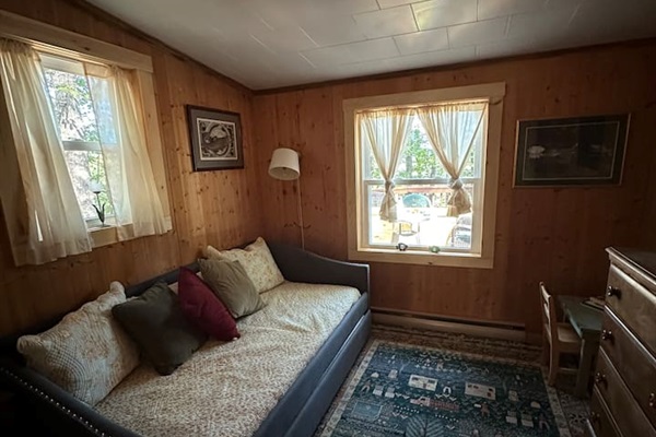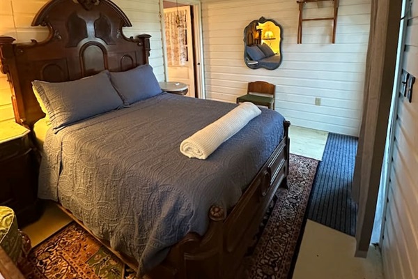 Rest easy in the main double bedroom, complete with soft linens, blackout curtains, and charming cabin views. Quiet, private, and ideal for a good night’s sleep after a day outdoors.