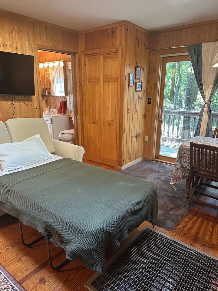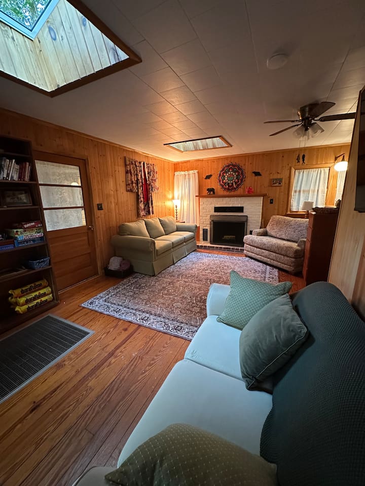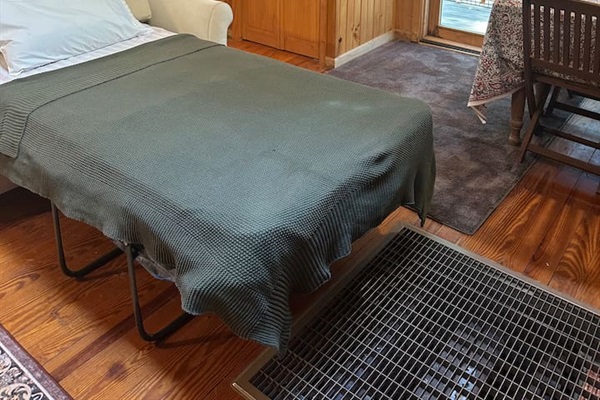 Cozy living room with two sleeper sofas — one folds into a twin bed, the other a cot-size. Perfect for extra guests! Fresh bedding is stored in the closet. Ideal for relaxing after a day exploring the orchards, trails, or lakes nearby.