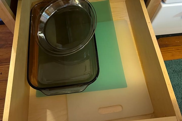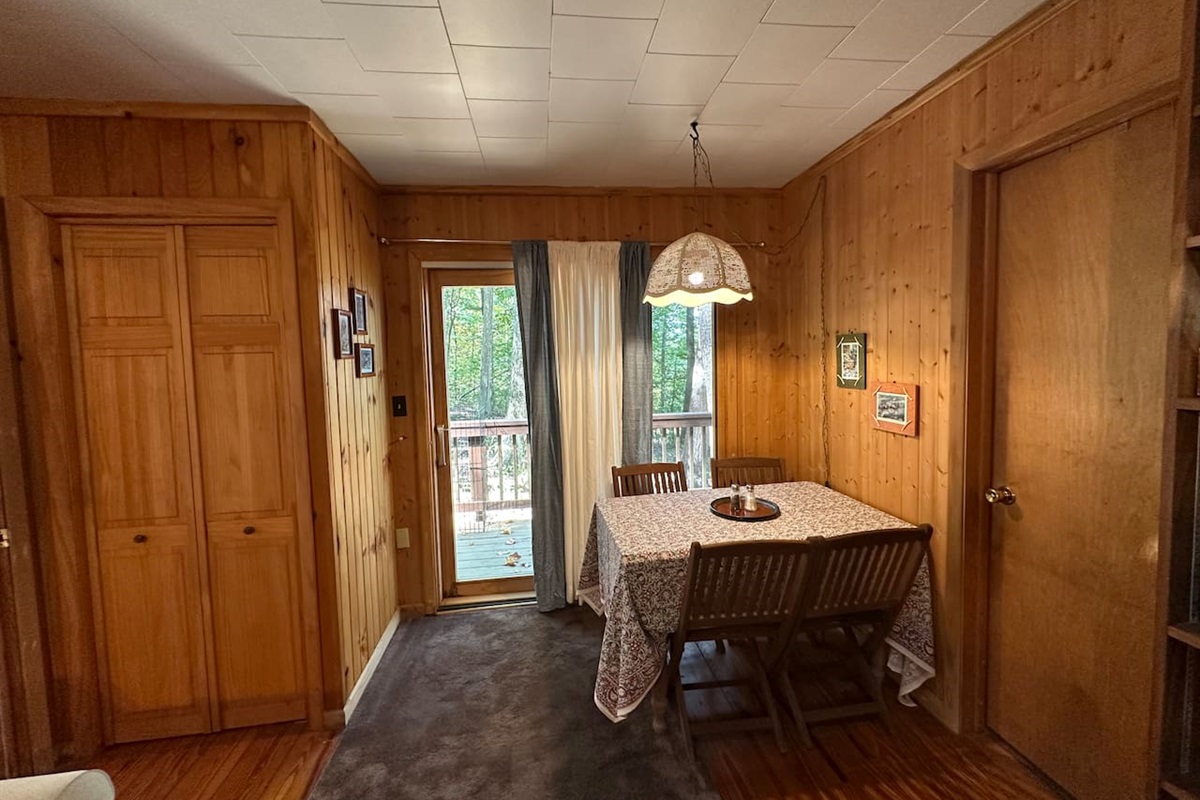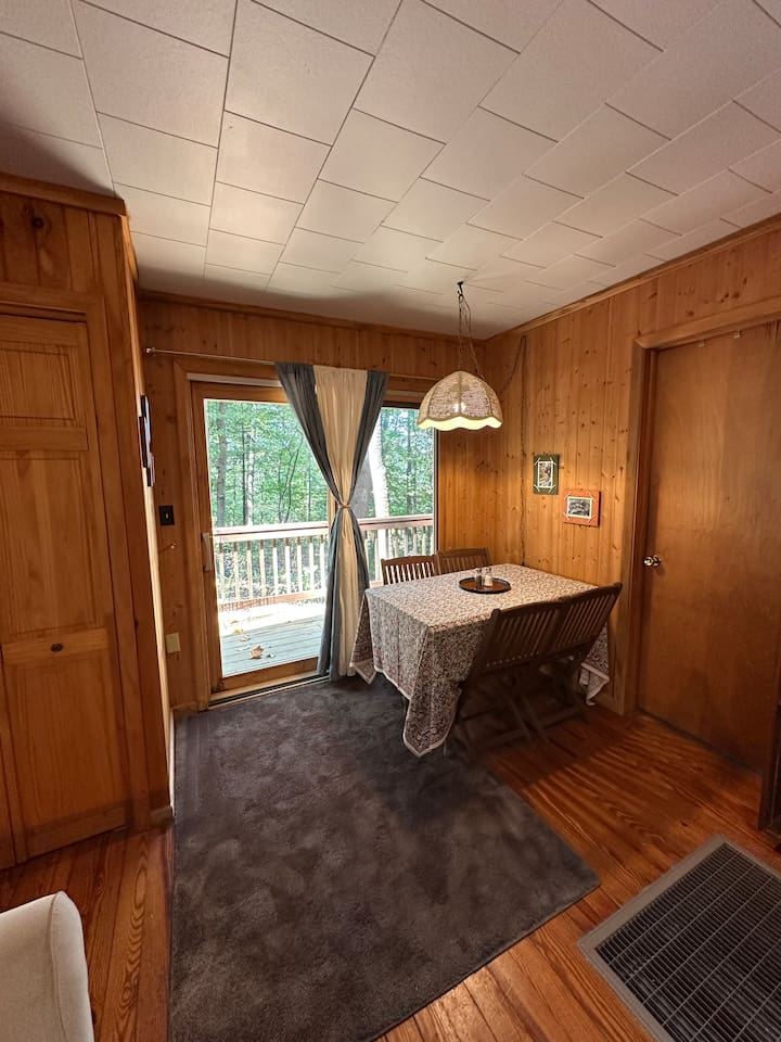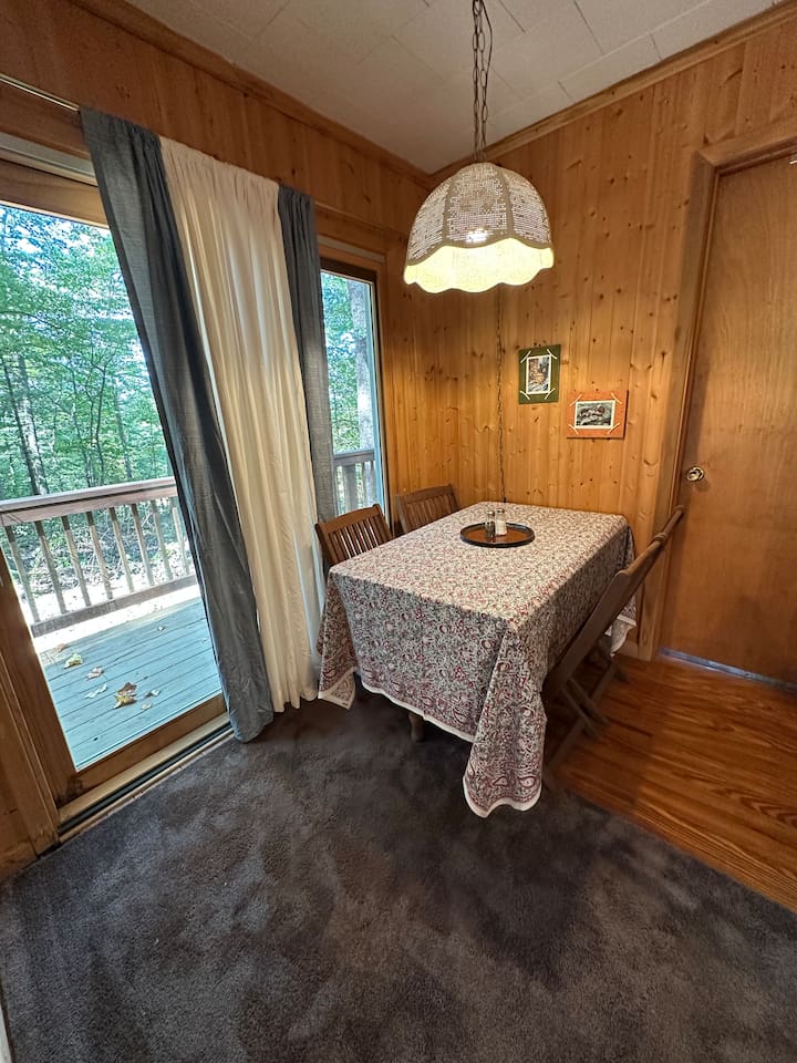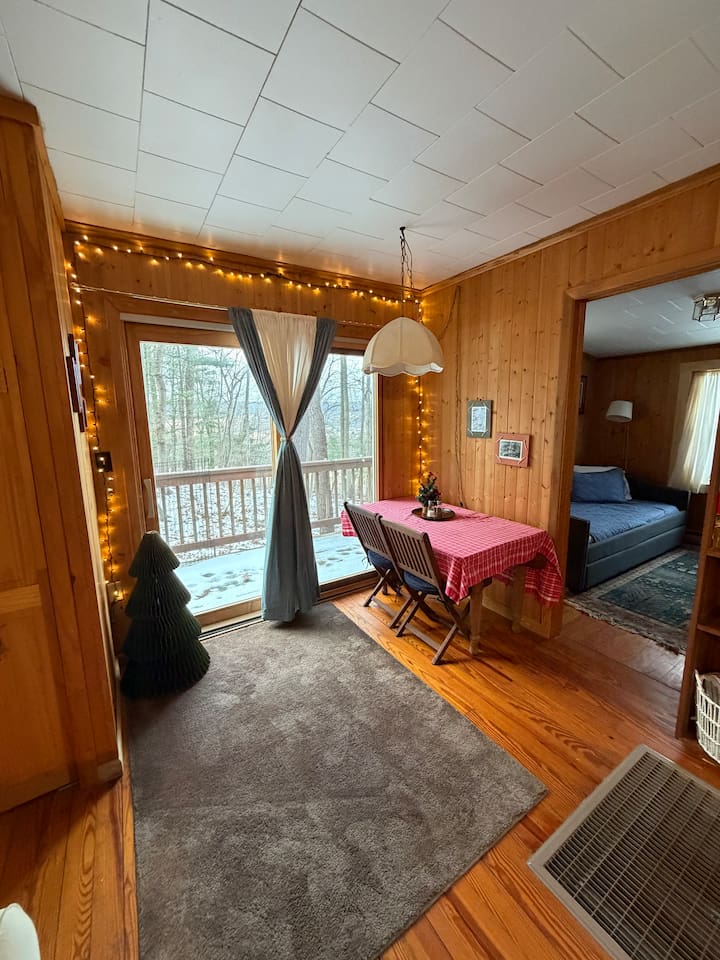 The dining area features a leaf table with four chairs, plus two extras stored in the cabin. It sits in front of a sliding glass door, offering a nice view and natural light. Great for meals, puzzles, or planning your day in the orchard.