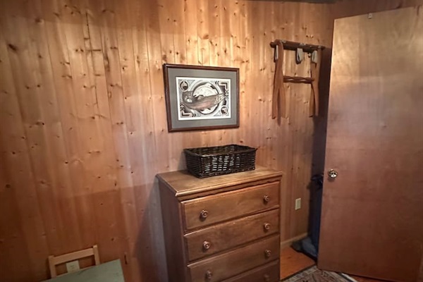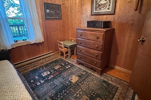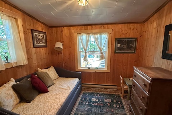 This twin bed with pull-out trundle is perfect for kids or extra guests. Bright and airy with closet storage, it’s a cozy nook for rest or quiet time. Extra linens in closet. Extra pillows in dresser